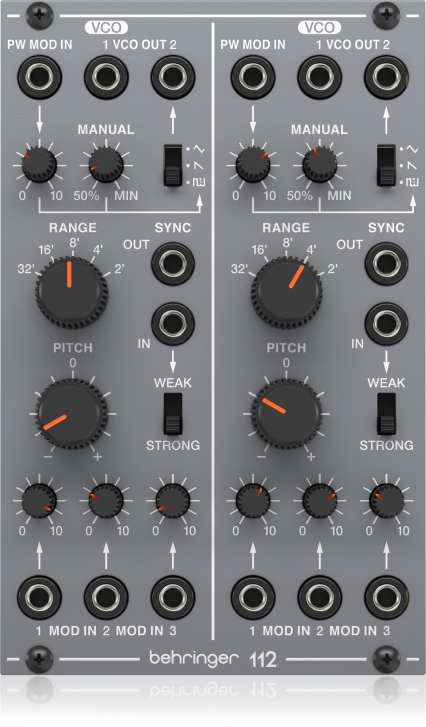 Jeder Oszillator verfügt über zwei identisch beschaltete Ausgänge, über die Sie die aktuell für den VCO gewählte Wellenform abnehmen können. Hinzu kommen jeweils drei Steuereingänge mit individuellen Abschwächern, sodass Sie sich ein zusätzliches Attenuator-Modul sparen können. Den ersten Modulationseingang wird man in der Regel für Pitch-CV nehmen, also die Tonhöhe der aktuell gespielten Note. An dieser Stelle fällt ein Nachteil des Behringer-Systems z. B. gegenüber dem Nachbau von Roland auf: Die Module sind nicht „normalized“, es gibt also keinerlei interne Vorverkabelung. Im Regelfall werden Sie beide Oszillatoren mit einer Pitch-CV parallel ansteuern. Das bedeutet aber auch, dass Sie diese Pitch-Quelle mit den Eingängen beider Oszillatoren verbinden müssen, eine Verbindung mit dem Modulationseingang von VCO1 wirkt nicht automatisch auf VCO2. Sie benötigen also ein Multiple-Modul oder zumindest ein Stackcable, um das Signal zu verteilen.