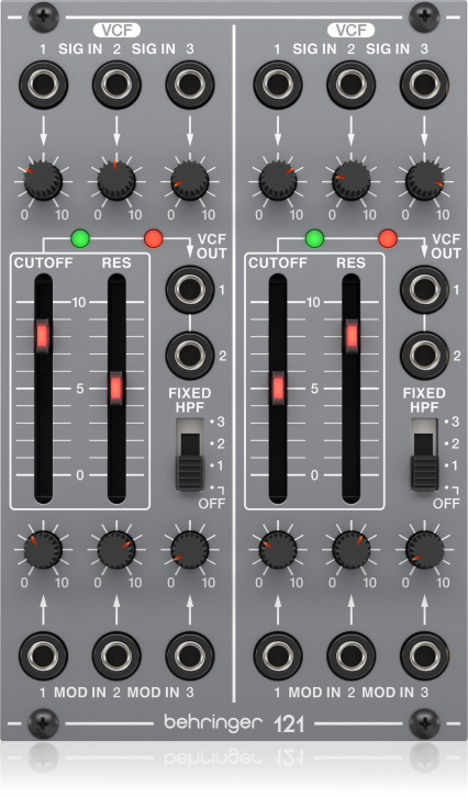Als nächstes Modul folgt das Dual-VCF 121. Es bietet zwei 24dB-Tiefpassfilter mit regelbarer Resonanz, jeweils mit zusätzlichem statischen Hochpassfilter (schaltbar in drei Stufen) zur Ausdünnung des Bassbereichs. Die Filter haben den typischen Roland-Sound, der Klassiker wie SH-101 oder Juno so beliebt macht. Sie klingen extrem musikalisch und schön cremig, verleihen dem Eingangssignal eine angenehme Wärme und bei hohen Resonanzwerten lassen sich herrlich harmonische Verzerrungen erzeugen. Typische SH101-Gummi- band-Bässe sind ebenfalls machbar. Auch Plug-ins, die wir im Test alternativ zum VCO-Modul durch die Filter gejagt haben, haben klanglich deutlich durch das Dual-Filter gewonnen, sodass sich das Modul auch als günstige Stereo-Filterbank empfiehlt. Gleich drei Eingänge stehen für jedes Filter zu Verfügung. Da jeder dieser Eingänge über einen eigenen Lautstärkeregler verfügt, können Sie direkt am Modul steuern, wie heiß das Filter vom Oszillatorsignal angefahren werden soll. Zudem ersparen Sie sich einen vorgeschalteten Mixer, da Sie problemlos neben den beiden VCO-Signalen auch Rauschen aus dem Noise-Generator des Ringmodulator-Moduls in regelbarer Lautstärke einschleifen können.