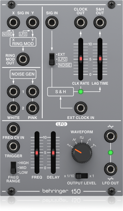 Zusätzlich zu den beiden Hüllkurven enthält das Modul einen flexiblen LFO mit fünf Wellenformen, die sich parallel in normaler und phaseninvertierter Version abnehmen lassen. Das ermöglicht neben typischen Einsatzgebieten wie Vibrato und PWM auch spannende Stereo-Modulationen in Verbindung mit Dual-VCF und Dual-VCO. Der LFO besitzt zusätzlich einen Trigger-Eingang, um die Wellenform per Gate/Trigger zu starten. Und auch ein CV-Eingang zur Steuerung der Frequenz ist vorhanden. Da sich die Geschwindigkeit in drei Stufen bis in den Audi- obereich (0,5 bis 30 Hz) schalten lässt, ist theoretisch auch eine Nutzung als dritter hörbarer Oszillator möglich. Leider trackt der Frequenzeingang ähnlich wie beim Behringer Crave aber nicht oktavrein, sodass eine auf dem Keyboard gespielte Oktave beim LFO nur für 10-11 Halbtöne reicht.
