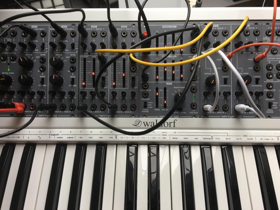 Für den Test haben wir die Module in ein kb37 von Waldorf verbaut, was sich als perfekter Partner erwies. Aufgrund der direkten Verbindung mit gutem Fatarkeyboard und Arpeggiator sowie der Möglichkeit, über Anschlagdynamik, Aftertouch und Modulationsrad, die Lautstärke, Filterfrequenz, LFO-Geschwindigkeit oder die Tonhöhe zu modulieren, konnten wir das System 100 ohne zusätzliche Hardware wie ein richtiges Instrument dynamisch spielen. Das kb37 unterstützt auch eine duophone Spielweise, sodass Sie zwei Tasten gleichzeitig spielen und damit die beiden VCO getrennt ansteuern können. Und dazu sieht das Ganze auch noch richtig schick aus – zumindest bis zur Verkabelung. Denn wie bereits angesprochen ist bei den dualen Modulen nichts vorverkabelt und es müssen für einen duophonen Stereo-Sound schon eine Menge Strippen gezogen werden. Dann wird es aber auch relativ schwierig, an die kleinen Regler zur Einstellung der Modulationsstärken heranzukommen. Auch die Fader sind nicht unbedingt riesengroß ausgefallen. Sie haben dafür aber den Vorteil, dass sich z. B. die Frequenzen beider Filter mit nur einer Hand gleichzeitig anpassen lassen.