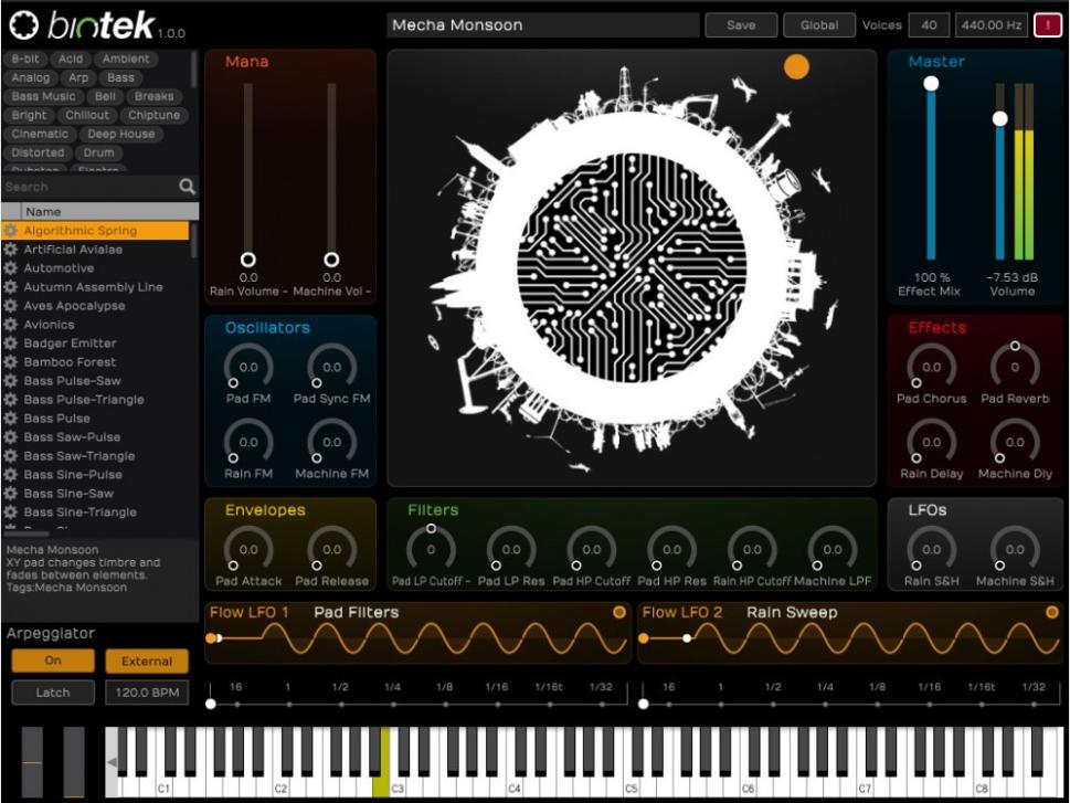 Mit seiner fortschrittlichen Sampling- und Synthese-Engine verspricht BioTek, der neue Klangerzeuger aus dem Hause Tracktion Software, frische Hybriden im Spannungsfeld zwischen modernen elektronischen Sounds und Field-Recordings. Als Grundlage dienen Synthesizerwellenformen sowie Sounds aus Natur sowie urbanen und technischen Umgebungen. Das Spektrum der 128 Patches reicht von klassischen analogen Bässen, Leads und FM-Sounds über komplex animierte Sequenzen und Drumloops bis hin zu futuristischen Ambient- und Effektklängen. Leider gibt es jedoch keine Möglichkeit, eigene Sounds von Grund auf neu zu programmieren. Die Klangbearbeitung und veredelung der Presets erfolgt mithilfe eines Satzes von Makroreglern. So steuern die vier Regler der Oszillatorsektion je nach geladenem Patch beispielsweise die Lautstärke verschiedener Oszillatoren oder die Sync- oder FM-Intensität. Mit dem großen, optisch schick in Szene gesetzten X/Y-Controller im Herzen der Bedienoberfläche können Sie nahtlos zwischen eher organischen und synthetischen Soundvarianten überblenden. Steuert man diese Parameter mittels MIDI-Controller, lassen sich spannende Echtzeit-Performances erzielen. Auch bei den komplexen Flow LFOs sind die Wellenformen für jedes Preset vordefiniert, lediglich die Rate lässt sich anpassen.